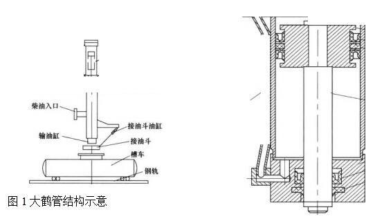 12道火車導軌上方,裝車時,進行兩道交替裝升降油缸和輸油缸安裝在裝卸鶴管筒體內,升降油缸活塞桿與輸油缸連接,升降油缸活塞桿上下移動時,輸油缸跟著上下移動。裝卸鶴管安裝在鶴管小車上,鶴管小車可以在小車軌道上水平移動。水平油缸活塞桿與鶴管小車連接,水平油缸活塞桿水平移動時,鶴管小車跟著水平移動。接油斗油缸活塞桿與接油斗連接,可以使接油斗提起和收回。升降油缸結構示意圖見圖2,活塞密封圈和活塞桿密封圈都是YX型密封圈,材質是氟橡膠。升降油缸長度4.8m0