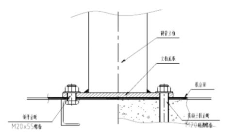 將裝卸臂鶴管的立柱置于棧臺(tái)面上,然后用4根M20的螺栓將立柱底板固緊在平臺(tái)上, (根據(jù)需要可借助事先備好的墊板將立柱調(diào)垂直,同時(shí),注意鋼棧臺(tái)與混凝土棧臺(tái)所用螺栓的長(zhǎng)度不同)。