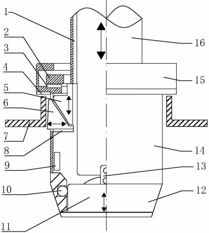 工作過程為:操作鶴管到油罐車口上方,鶴管下降、使對(duì)位體對(duì)準(zhǔn)罐車口,對(duì)位體進(jìn)入油罐車口,利用動(dòng)力裝置繼續(xù)使鶴管下降,不同心位置由密封帽密封蓋水平移動(dòng)密封。鶴管繼續(xù)下降,當(dāng)一密封墊接觸油罐車口,對(duì)位活動(dòng)壓盤繼續(xù)下降,推動(dòng)一鎖緊塊向下動(dòng)作,一鎖緊塊繼而帶動(dòng)二鎖緊塊沿導(dǎo)軌滑動(dòng),從而鎖緊油罐車口,對(duì)位活動(dòng)壓盤壓緊二密封墊。同時(shí),密封體隨著鶴管下降,脫離接油斗,使油液順利流出,從而進(jìn)行裝油作業(yè)過程。裝油作業(yè)完成后,鶴管上升,從而密封體上升,封堵住接油斗出口,使滴油密封在接油斗中。此時(shí)對(duì)位活動(dòng)壓盤提升,解除對(duì)二鎖緊塊的壓力,使二鎖緊塊回位,解除鎖緊,密封帽密封蓋回到原位置,為下次工作創(chuàng)造條件。