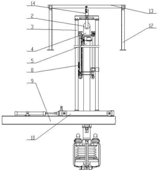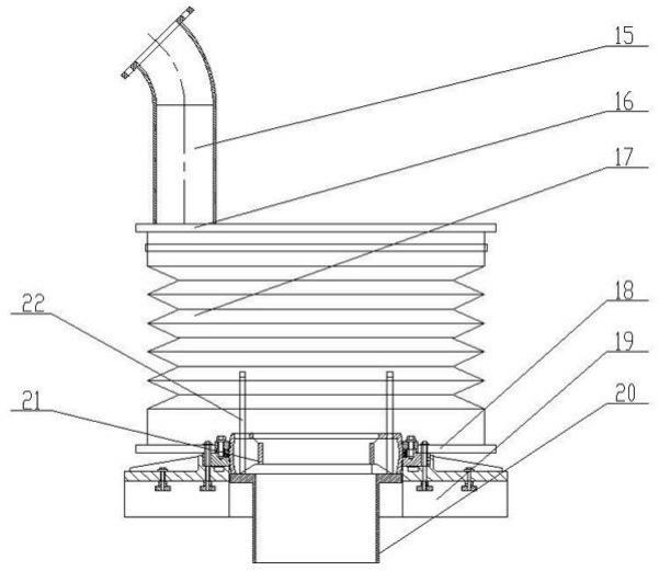 復(fù)合軟管下方設(shè)有軟管支撐架。直通管內(nèi)壁上部設(shè)有與外套管配合的除塵圈,直通管內(nèi)壁下部設(shè)有與外套管配合的清潔填料。清潔填料包括柔性石墨和聚四氟乙烯。限位吊桿穿過調(diào)整環(huán)的內(nèi)環(huán)與外環(huán)之間的通孔,在限位吊桿的頂部設(shè)有吊在調(diào)整環(huán)上的掛鉤。密封帽兩側(cè)設(shè)有固定架,固定架上設(shè)有橫梁,上密封帽的上部設(shè)有與橫梁配合的行走鎖緊裝置。外套管升降的驅(qū)動(dòng)機(jī)構(gòu)包括兩個(gè)對(duì)稱設(shè)置在外套管外側(cè)的鏈輪機(jī)構(gòu)和驅(qū)動(dòng)鏈輪機(jī)構(gòu)上下移動(dòng)的滑移油缸。