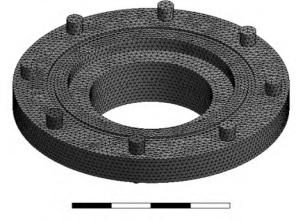 為了便于分析,設(shè)計采用了Solidworks中Work-bench模塊。接頭中金屬材料選用不銹鋼材料,網(wǎng)格劃分的大小設(shè)置為3mm長度,其中外法蘭盤劃分效果如圖4所示。