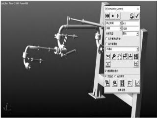 將裝卸鶴管中各物體連接關(guān)系以及驅(qū)動設(shè)置好之后即進行運動仿真,運動時間為4s,運動步數(shù)為1200步,仿真界面如圖8所示。