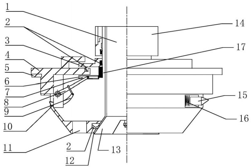 其中,1-鶴管,2-密封圈,3-對位盤,4-蓋體,5-密封墊,6-滑動槽,7-滑桿,8-加力桿,9-弧形鎖緊爪,10-弧形槽,11-通氣口,12-錐形開口,13-鶴管錐形結(jié)構(gòu),14-動力氣缸,15-導(dǎo)向滑塊,16-彈簧,17-氣體回收通道。