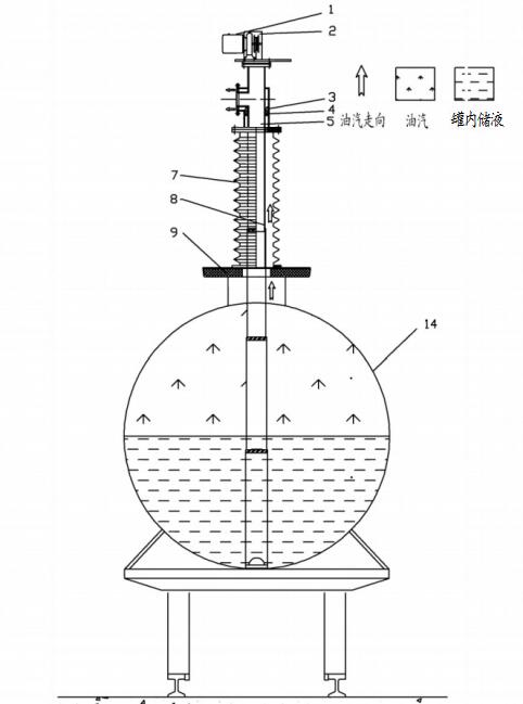 可伸縮油氣回收管另一端通過(guò)復(fù)合三通與鶴管的氣相管連接,復(fù)合三通一端通過(guò)法蘭與可伸縮油氣回收管連接,另一端套裝在伸縮垂直管的出液口上。