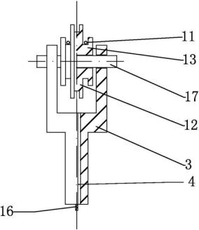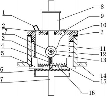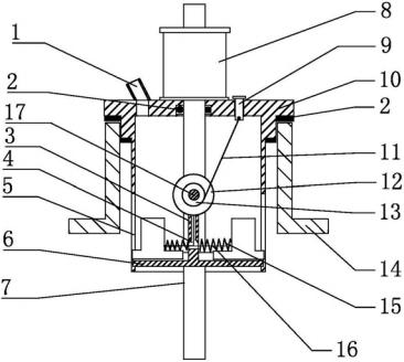 其中,1排氣口,2密封圈,3支撐架,4鋼絲繩通道,5鎖舌,6鎖舌托盤,7鶴管,8氣缸,9鋼絲繩調(diào)節(jié)螺釘,10密封蓋,11固定鋼絲繩,12一滑輪,13二滑輪,14罐車車口,15推力彈簧,16張緊鋼絲繩,17支撐軸。