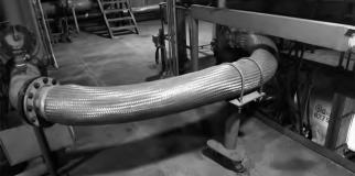 鐵路裝車大鶴管系統(tǒng)為WD-200B型液下密閉裝車鶴管,鶴管結(jié)構(gòu)如圖1所示。鶴管中段由一根金屬軟管連接,金屬軟管(規(guī)格DN200)長(zhǎng)3200mm、兩端法蘭連接,金屬軟管結(jié)構(gòu)形式可以彌補(bǔ)鶴管對(duì)位槽車口左右行產(chǎn)生的位移串動(dòng)量(圖2)。
