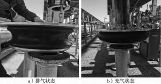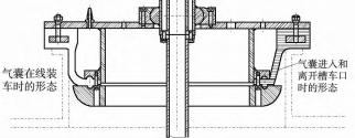 氣囊放氣后為V弧形狀方便下放及上提鶴管,充氣后為鼓圓形狀、形成極佳的密封副(圖8)。優(yōu)點(diǎn)是膨脹系數(shù)大,單邊膨脹50mm,能滿足各種車型使用。上有平面鋁板,能消除對(duì)位撞圖7氣囊密封蓋結(jié)構(gòu)擊產(chǎn)生火花。有錐形防碰、導(dǎo)向機(jī)構(gòu),對(duì)位時(shí),當(dāng)錐形鋁導(dǎo)向進(jìn)入車內(nèi),氣囊充氣后鶴管自動(dòng)對(duì)中,同時(shí)如鶴管對(duì)偏位,還可保護(hù)氣囊不被撞壞。氣囊有耐油、耐苯、耐老化、使用壽命長(zhǎng)、防靜電功能。蓋板上安裝壓緊密封裝置,雙層密封結(jié)構(gòu)更好的防治油氣溢出。