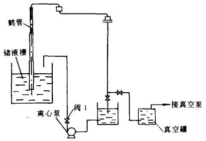 出廠前應在強度試驗合格后將鶴嘴伸到大長度(對圖1將各套簡展開),使底部放入儲液槽內(有條件時,盡量用所卸介質中揮發(fā)性較大者),然后用真空泵將液體抽上,使鶴管及所連管道內充液高度大于鶴嘴長度,造成虹吸條件(見圖3),而后停泵,打開閥1,開動離心泵(或用桶)為被抽吸的儲液槽補加相應介質,使鶴嘴下端不脫離液面,持續(xù)30min無斷流(其間應擺動鶴嘴)為合格。