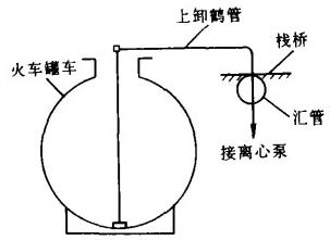 由于上卸棧橋一般較長,鶴管較多,連于泵房的匯管比棧橋更長。對于高位布置的匯管,將有幾十個鶴管連于其上,同時進行卸油作業(yè),管系中有許多閥門、法蘭和鶴管,總要有些泄漏。由于匯管處于一定的真空狀態(tài),空氣將通過這些不嚴密處進入匯管,加之一些易揮發(fā)性介質,也因真空工況而汽化,而接入泵房泵上的工藝管線只能在棧橋一端或中部,進入匯管的氣體不能及時被泵抽走而集聚在匯管頂部,使匯管的真空度降低,且隨著火車罐車內液面下降及時間的推移,真空度越來越低,破壞了鶴管的虹吸能力,使上卸速度減慢,甚至終止卸油。在匯管與接向泵房的管道相交處,液流中的氣體含量增多,泵的工作條件惡化。另外多個鶴管不可能同時卸完,先卸完的鶴管鶴嘴下端,空氣瞬時傳入鶴管進入匯管,使匯管中的真空度破壞,必將中斷各鶴管的上卸作業(yè)。
