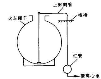 在上卸作業(yè)的工藝流程中,對于匯管的布置有兩種方式,即高位匯管(見圖4)和低位匯管(見圖5)兩種。前者將匯管安裝在棧橋面下,在火車罐車高及低液位之間;低位匯管是將其安裝在地面或地下,處于火車罐車低液面之下。