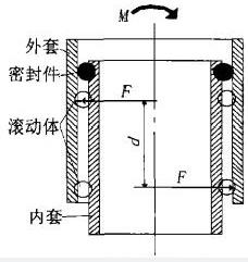 該迥轉(zhuǎn)器主要由內(nèi)套、外套、滾動(dòng)體、密封件組成。鶴管上部所有部件的重量所生產(chǎn)的力矩M通過(guò)迥轉(zhuǎn)器的外套傳給內(nèi)套,再向下傳到基座上,因此彎矩M將在滾動(dòng)體與外套以及滾動(dòng)體與內(nèi)套的接觸處產(chǎn)生很大的作用力(F=M/d)。而滾動(dòng)體與內(nèi)套、外套之間是線接觸,因此壓應(yīng)力σ非常大,可能超過(guò)內(nèi)、外套材料的許用應(yīng)力[σ],使?jié)L道產(chǎn)生塑性變形。滾道產(chǎn)生塑性變形后,在變矩M的作用下,內(nèi)套與外套之間出現(xiàn)偏心,于是密封件的半邊被壓得很緊,而另半邊密封件與內(nèi)、外套之間會(huì)出現(xiàn)間隙,導(dǎo)致迥轉(zhuǎn)器泄漏。