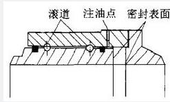 圖2中迥轉(zhuǎn)器的回轉(zhuǎn)部位注油口設(shè)計(jì)在2滾道中間,只有滾道槽、鋼球得到了潤(rùn)滑,而遠(yuǎn)離軌道的關(guān)鍵部位——密封表面卻得不到潤(rùn)滑。另外,金屬滾道摩擦表面忽視了防銹處理,產(chǎn)生腐蝕后摩擦力增大,加劇了磨損后的滲漏。